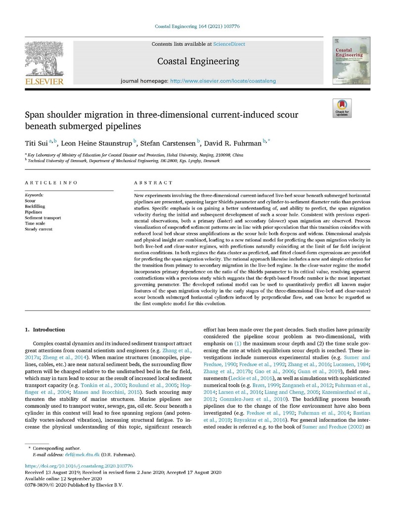 近日,NT动漫 教师隋倜倜在海底管道冲刷领域取得进展,与丹麦科技大学海岸工程团队合作研究成果在一区期刊《Coastal Engineering》上发表,标题为“Span shoulder migration in three-dimensional current-induced scour around submarine pipelines”。
