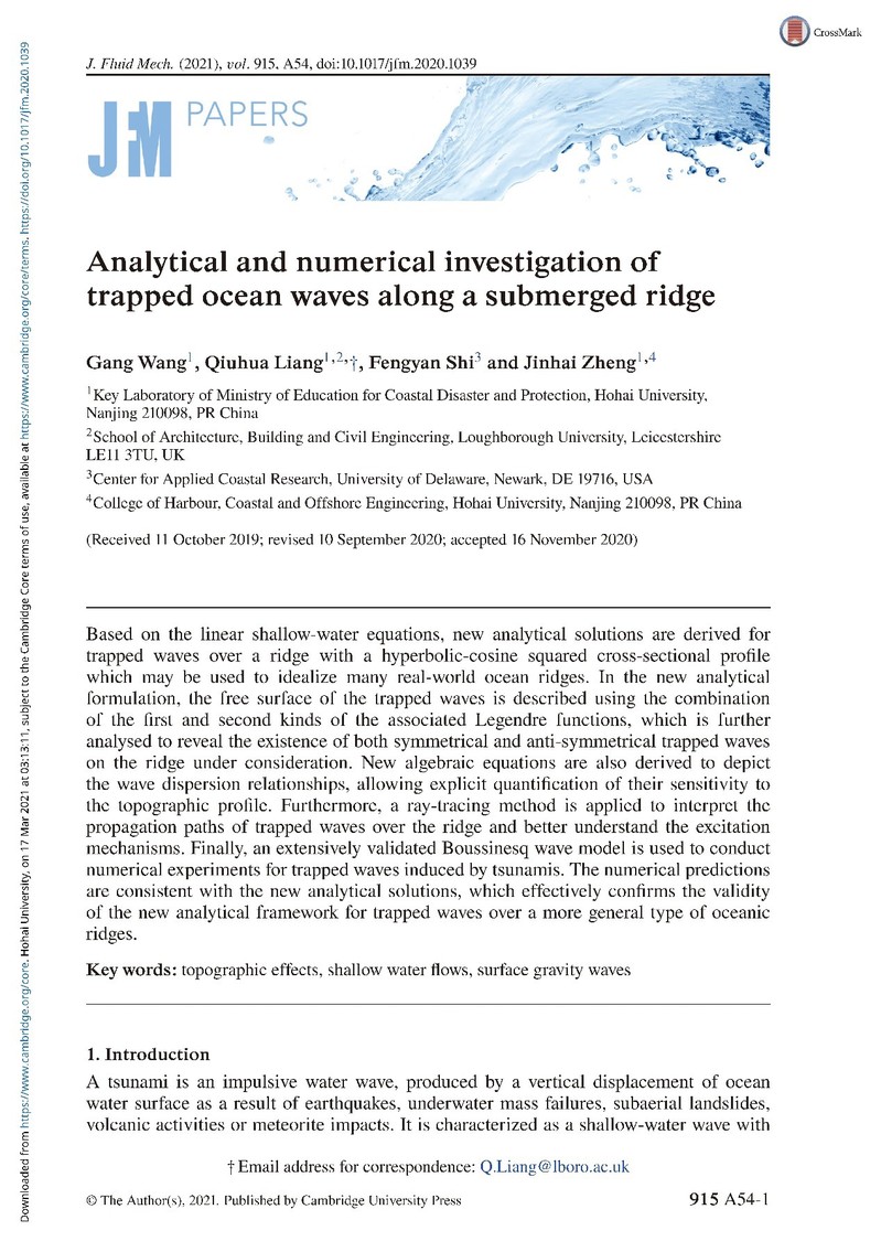 王岗副教授、 “河海学者”讲座教授及英国拉夫堡大学Qiuhua Liang博士、美国特拉华大学Fengyan Shi博士和郑金海教授合作完成的研究论文“Analytical and numerical investigation of trapped ocean waves along a submerged ridge”发表在流体力学领域享有盛誉的国际顶尖期刊《Journal of Fluid Mechanics》上(//doi.org/10.1017/jfm.2020.1039)。研究工作得到国家自然科学基金(52071128和51579090)的资助。
