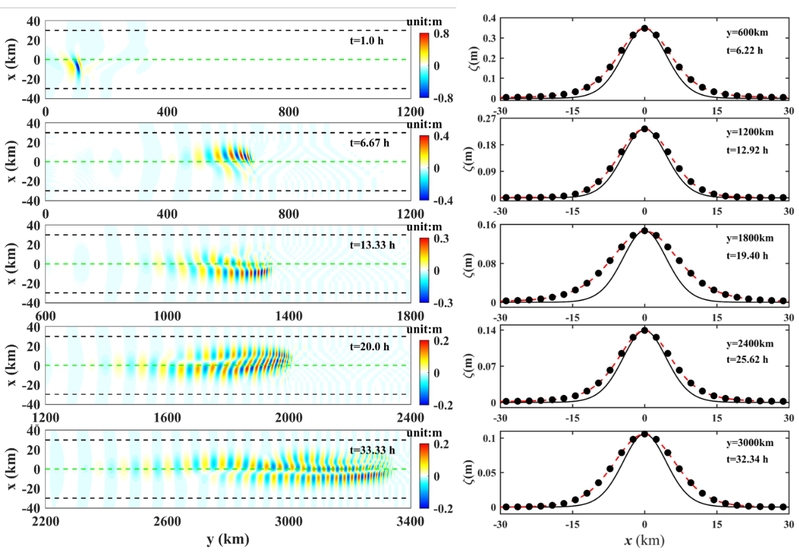 研究团队基于线性长波理论推导出了双曲余弦平方型大洋海脊上的俘获波解析理论,从波浪在海脊上的传播路径上阐明了海脊俘获波由于波浪折射效应而存在的产生机理。理论分析表明,大洋海脊上分别存在着奇偶模式的海脊俘获波,其波面过程可以表示为连带勒让德函数的形式。奇模式海脊俘获波的波面在脊顶始终为零,沿海脊两侧以反对称的形式运动;偶模式海脊俘获波的波幅在脊顶最大,波面在海脊两侧对称运动(图 2)。俘获波对应的频散关系可以表示为代数多项式的形式,由其可显式表达出相应的相位速度和能量速度。海脊俘获波的相位速度随着周期的增加而增加,但其能量速度却随着周期的增加而减小。通过数值计算模拟海啸在大洋海脊上的传播过程,结果表明大部分海啸波都被限制在海脊地形上以俘获波的形式传播,波幅沿海脊截面的分布与理论完全吻合(图 3);由海脊不同位置处的波面过程对应的小波谱证实了理论分析发现的短周期俘获波能量传播较快而率先抵达的现象(图 4)。