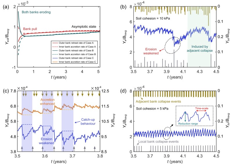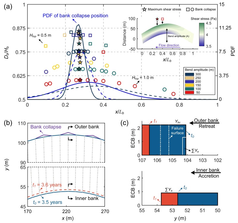 曲流/蜿蜒迁移由凸岸淤积和凹岸侵蚀、坍塌间的相互作用引起。然而,较少有研究关注单个崩岸过程在曲流演变中所起的作用。本研究建立了曲流演变数值模型,直接考虑崩岸的影响,模型结果表明崩岸与曲流迁移的相互作用密切,弯道曲率和近岸水动力特征决定了崩岸的发生位置;反过来,崩岸加快了弯道的迁移速率,驱动弯道曲率变化。当弯道从小振幅正弦曲线开始演变,初始散乱分布的崩岸过程逐渐趋向于在水流切应力峰值区域发生,表明弯道演变逐渐从岸壁稳定性主导(由相对水深表征)转变为水动力主导(由近岸水流切应力分布表征)。弯道的迁移可通过凹岸和凸岸之间的追赶行为描述,该行为由凹岸的间歇性坍塌,和随后凸岸的持续淤积驱动。本研究促进了多学科交叉发展,推动了河口、海岸地区曲流演变方向的研究。