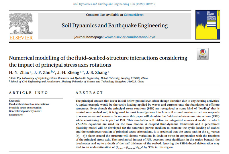 2021年12月16日,国际著名学术期刊《Soil Dynamics and Earthquake Engineering》(SDEE)公布2020年度最佳期刊论文奖(The SDEE Ahmet Cakmak 2020 Best Paper Award)。NT动漫 河口海岸综合治理与保护研究团队的“Numerical modelling of the fluid-seabed-structure interactions considering the impact of principal stress axes rotations”的论文获得殊荣。该奖项由SDEE期刊的三位主编及十二位副主编从该期刊上一年度论文中提名、遴选,并最终授予一篇具有突出贡献值得特别表彰的论文,这是该奖项设立以来首次授予中国研究人员。赵弘毅副研究员为论文第一作者,郑金海教授为共同通讯作者,合作者包括张继生教授和浙江科技学院的朱剑锋教授。论文得到国家自然科学基金委及江苏省科技厅的资助,首次在国际上阐明了波流、海工结构物与海床地基非线性耦合作用过程中主应力轴循环旋转对海工结构物及其海床地基动力响应机制的影响机理,于2021年3-5月入选ESI热点论文(前1‰)。