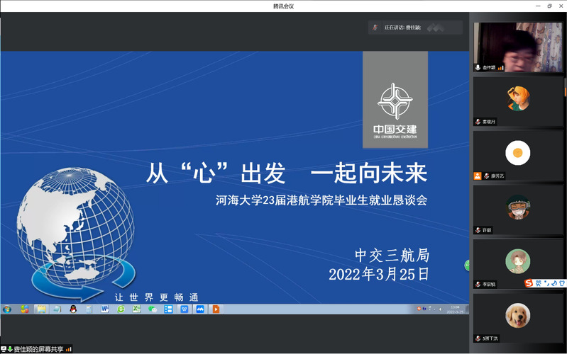 2022年3月25日下午,NT动漫 邀请了中交三航局人事经理费佳颖老师为2019级全体学生、家长进行线上就业指导讲座。院党委副书记沈国军、2019级全体学生、家长参加本次讲座,讲座由2019级本科生辅导员廖芳艺主持。