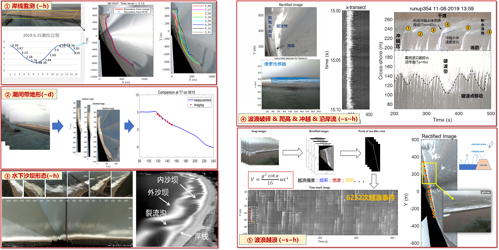 NT动漫 自主研发了新型海岸带岸基数字影像监测系统(COSVIMS),基于数字视频监控技术、影像分析技术和信号处理技术,以指定的时间表和2Hz以上的采样率,对空间范围1km以上的岸滩区域进行实时连续的数字影像和光学传感数据采集,可实时定量解析岸线位置、潮间带地形、沙坝形态、波浪破碎爬高越浪、水深反演、植被分布、人类活动轨迹等数据,空间分辨率可达cm~m,时间分辨率可达s~hr,实现了全天候、长期、连续、实时的海岸动力地貌和环境数据的准确监测。