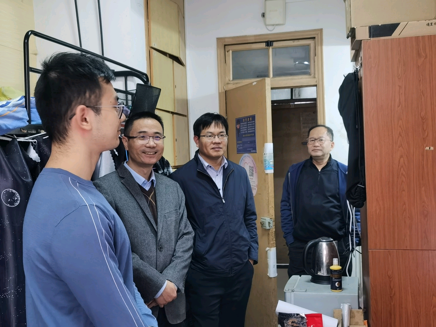 张俊基书记、沈国军副书记在2021级、2022级辅导员王恒星和顾钰恒的陪同下,走访江宁校区三舍、二十二舍和二十三舍,检查学生宿舍用电安全、消防设施等,关心新生入学适应情况、期中考试前的复习和心理调试,了解疫情管控之下学生的体育锻炼、饮食起居情况。提醒学生加强集体宿舍安全意识,引导学生劳逸结合、互帮互助,营造和谐友爱的社区氛围。