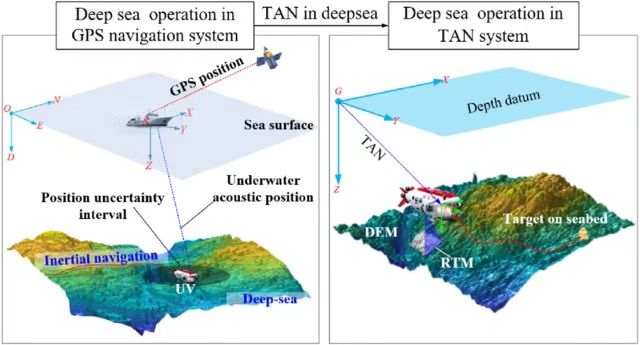 图2.声学定位(左)与海底地形辅助导航(右)示意图