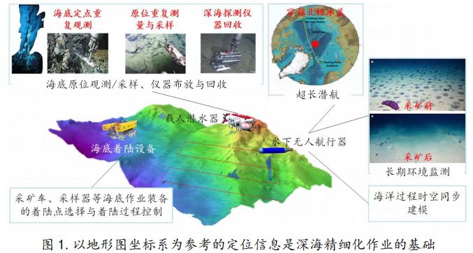 海底空间资源丰富且与人类未来发展密切相关。当前深海探测与作业技术已被列入国家安全与战略利益技术体系,是海洋战略前沿领域。由于深海空间处于高压、低温、通信拒止等极端环境下,人力因素很难及时介入和精确干预深海探测与开发过程,因此深海探测与开发装备【目前常用的海洋探测与开发装备包括:无人水下航行器(UUV,Unmanned Underwater Vehicle)、遥控式水下潜水器(ROV,Remote Operated Vehicle)、载人潜水器(HOV,Human Occupied Vehicle)等】必须具备自主作业能力和高度智能以执行规定任务和处理突发事件。而高精度的导航信息是深海探测与开发装备自主化、智能化作业的基础(图1),并在一定程度上反映了其智能化水平。