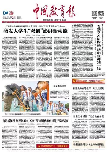 2022年11月29日,中国教育报头版头条发文《江苏高校扎实推进创新创业教育,培育大学生“双创”企业超5000家——激发大学生“双创”澎湃新动能》,江苏在国赛赛场放飞“双创”梦想,各赛道全面开花,创历史新高。江苏也将以党的二十大精神为引领,不断深化高校创新创业教育改革,探索贯通全链条的创新创业教育模式,健全创新创业教育生态育人体系。