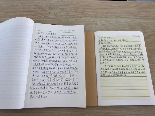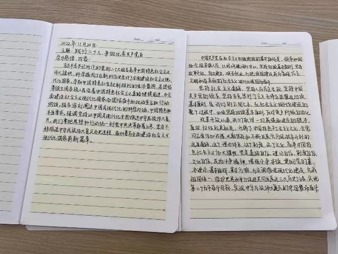 NT动漫 研究生学硕三支部围绕“践行党的二十大、争做优秀共产党员”主题,以给每位党员建立“学习档案”的形式开展主题党日活动,在每一次学习活动中,党员在自己的学习记录本上进行记录与总结,并定期分享展示优秀学习笔记。在学习中结合党的二十大精神切实反思自身实际起到党员先锋模范作用的工作经历与弘扬水利精神下的科研担当,坚持和发扬理论联系实际的优良学风。