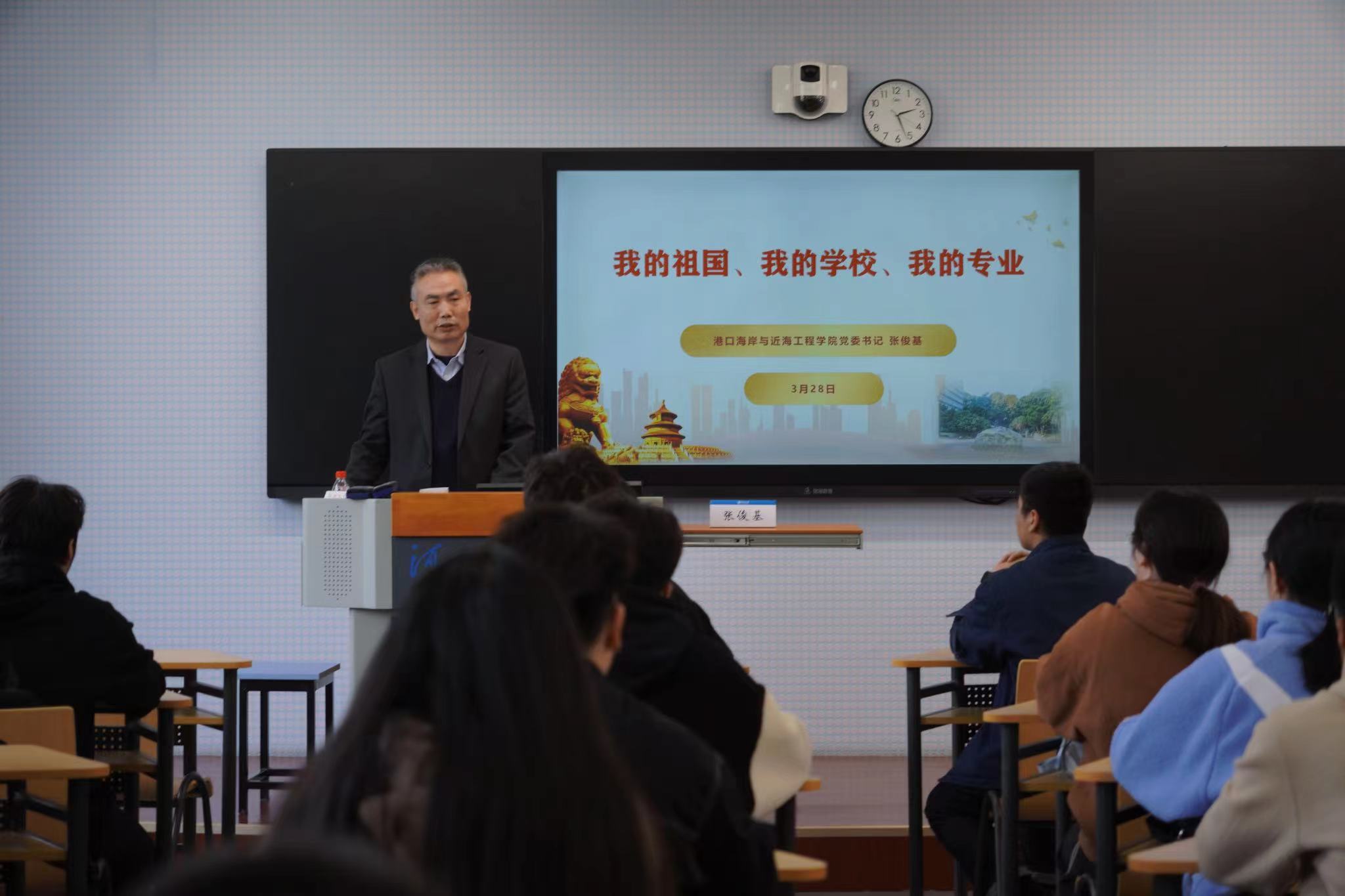 张俊基书记聚焦“新时代发展成就”、“学校认同”、“专业认知”三个方面,围绕“我的祖国”、“我的学校”、“我的专业”三个主题进行讲授,带领同学们系统学习了党的二十大精神要义,全面回顾了过去十年党和国家事业发展取得的历史性成就、发生的历史性变革。结合当前国情世情校情,阐释了国际国内的热点问题,聚焦新时代水利高质量发展,讲解了我校在服务国家建设中取得的跨越式发展。他与同学们共同分享了习近平总书记对青年的期望与寄语,强调同学们要坚定理想信念、听党话跟党走,要珍惜大学时光、练就过硬本领,要厚植家国情怀、践行使命担当。号召NT动漫 学子秉承“艰苦朴素、实事求是、严格要求、勇于探索”的河海校训,以国家“双一流”建设为契机,在服务水科学与国家重大需求,解决重大科技问题中展现港航力量和港航担当。