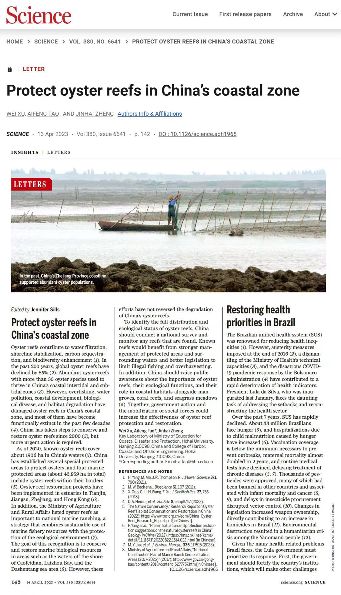 近日,NT动漫 河口海岸综合治理和保护研究团队在国际期刊《Science》上发表题为“Protect oyster reefs in China’s coastal zone”(图1)的LETTER,总结我国牡蛎礁海岸修复措施,呼吁进一步加强保护。团队博士生徐伟为第一作者、骨干陶爱峰教授为通讯作者、负责人郑金海教授为共同作者。