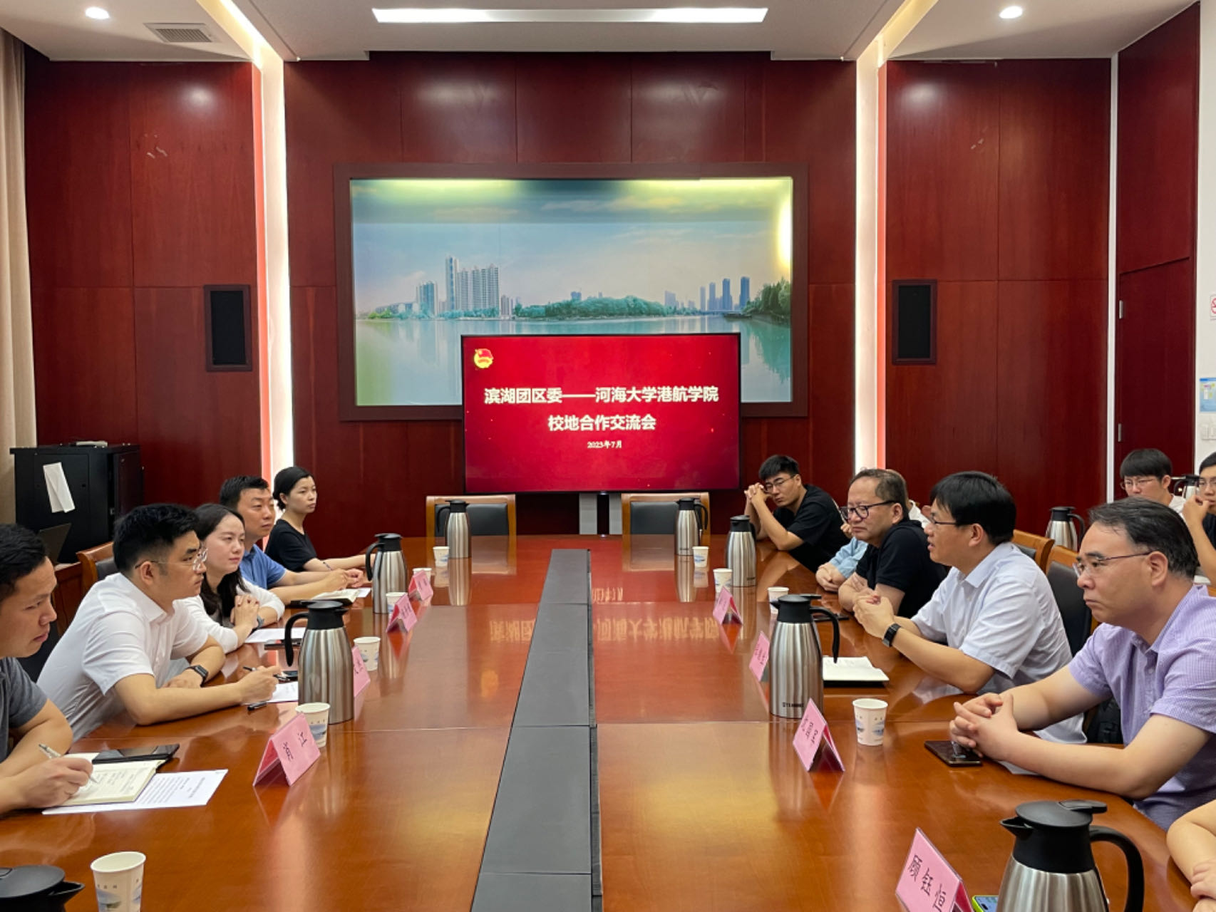 座谈会上,滨湖团区委书记张文杰对NT动漫 师生的到来表示热情欢迎,并向师生详细介绍了滨湖区的区位优势与特色产业发展,他指出,无锡90%的文旅资源和科研院所集中于滨湖,并欢迎NT动漫 学子毕业后到滨湖就业。NT动漫 副院长张继生对张书记等区团委领导表达感谢,并介绍了NT动漫 、NT动漫 学科布局、人才培养、科学研究、社会服务等建设基本情况与成就,并结合滨湖区特色产业与资源,提出促成校地深入合作的具体方向。