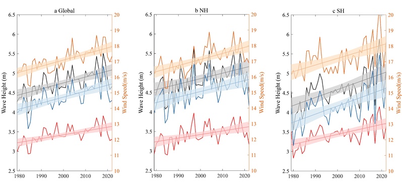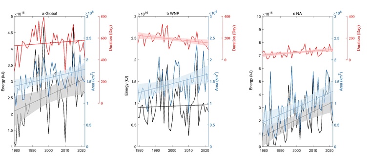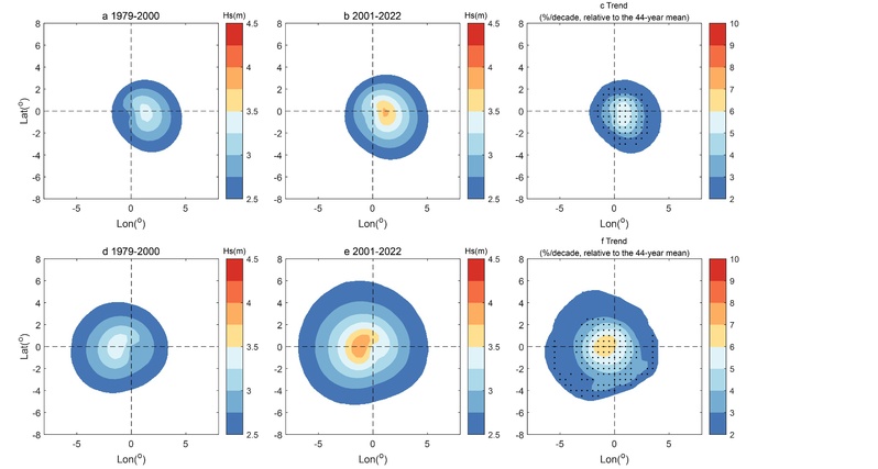NT动漫 河口海岸综合治理与保护研究团队与英国雷丁大学和帝国理工大学研究人员合作,在利用最新的浮标和卫星观测数据充分验证再分析波浪数据ERA5的基础上,通过定义台风浪波高阈值,提取全球波浪场中的台风浪分布特征,分析了1979-2022年台风引起的全球波高极值、影响面积和累积波浪能的变化趋势,推导了累积波能各项贡献率计算公式。研究发现近44年全球台风引起的波高极值增长明显,为0.32%/a,影响面积扩展速率为0.57%/a,累积波浪能增加速率为0.9%/a。全球台风浪累积波能的增加速率是波高增长速率的3倍,这由台风浪影响面积的扩展所主导。全球不同海区台风浪变化趋势差异明显,对于西北太平洋,波高极值和影响面积的增长速率快于全球,为0.41%/a和0.69%/a;但是累积波能的增长趋势不明显,这是由于西北太平洋年平均台风作用时间减少所致。