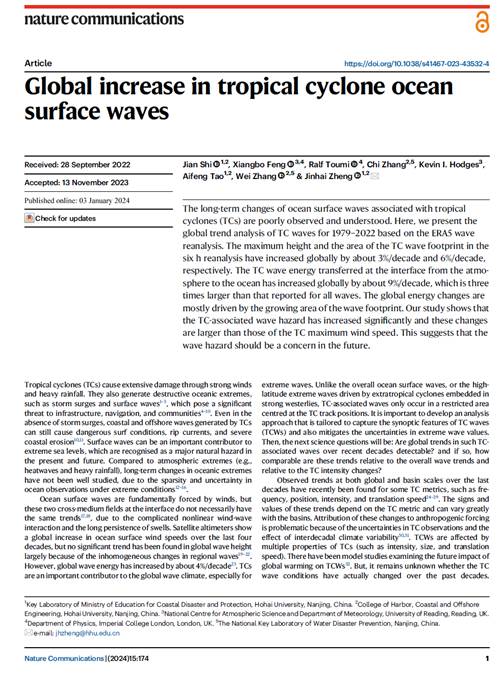 NT动漫 时健副教授、郑金海教授、张弛教授、陶爱峰教授、张蔚教授和雷丁大学冯向波高级研究员、Kevin I. Hodges教授以及帝国理工大学Ralf Toumi教授合作完成的研究论文“Global increase in tropical cyclone ocean surface waves”发表在国际学术期刊《Nature Communications》上(//www.nature.com/articles/ s41467-023-43532-4),研究工作得到国家重点研发计划重大自然灾害防控与公共安全海洋专项(2023YFC3007900)的支持。
