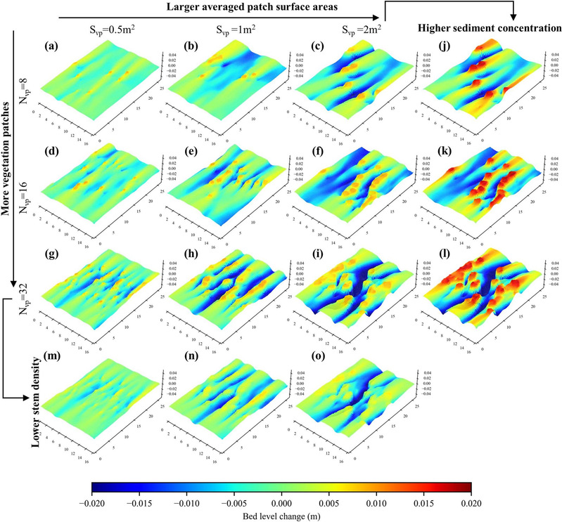图3 不同盐沼植被斑块分布与边界条件下的地貌演变模拟结果