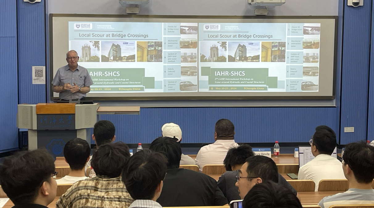Bruce Melville院士以“Local scour at bridge crossings”为题作了报告,并详细讲解了近40年来新西兰因洪涝导致的重大桥梁冲刷破坏事件以及相关桥墩基础冲刷预测方法。Kilisimasi Latu高级讲师以“Design and application of living roofs”为题报告了生态屋顶的设计理论与应用。唐子豪博士分享了他在奥克兰大学的读博经历与生活状态。随后,管大为副院长为大家详细介绍了我校与奥克兰大学的合作历史,以及NT动漫 -奥克兰大学双博士、双硕士项目的具体内容与申请条件。