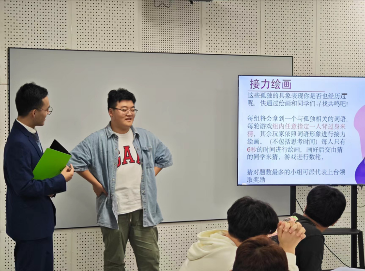 活动伊始,主持人向同学们简要介绍了活动主题及流程,并深入讲解了心理健康的评价标准与大学生中常见的心理健康问题。随后,借助科普视频与接力绘画游戏,同学们得以直观感受孤独的多维面貌,加深了对孤独概念的理解。