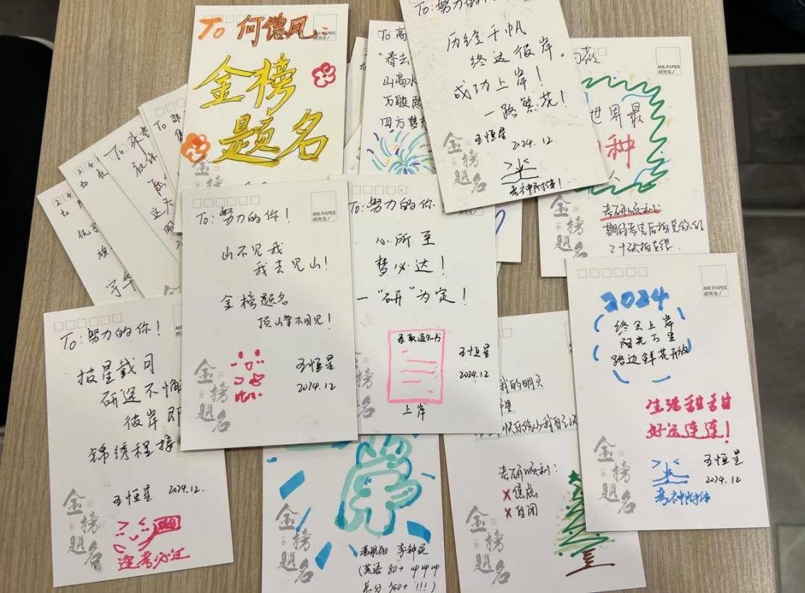 党的二十届三中全会强调了人才在中国式现代化进程中的关键支撑作用,明确指出教育、科技、人才是基础性、战略性支撑。习近平总书记在全国研究生教育大会上强调研究生教育要适应党和国家事业发展需要,培养造就大批德才兼备的高层次人才。即将踏上考研战场的大四学子们,肩负着自我提升与国家未来建设相融合的使命。深知此意义非凡,党支部精心策划了一场充满温情与力量的活动——为考研学子手绘贺卡。
