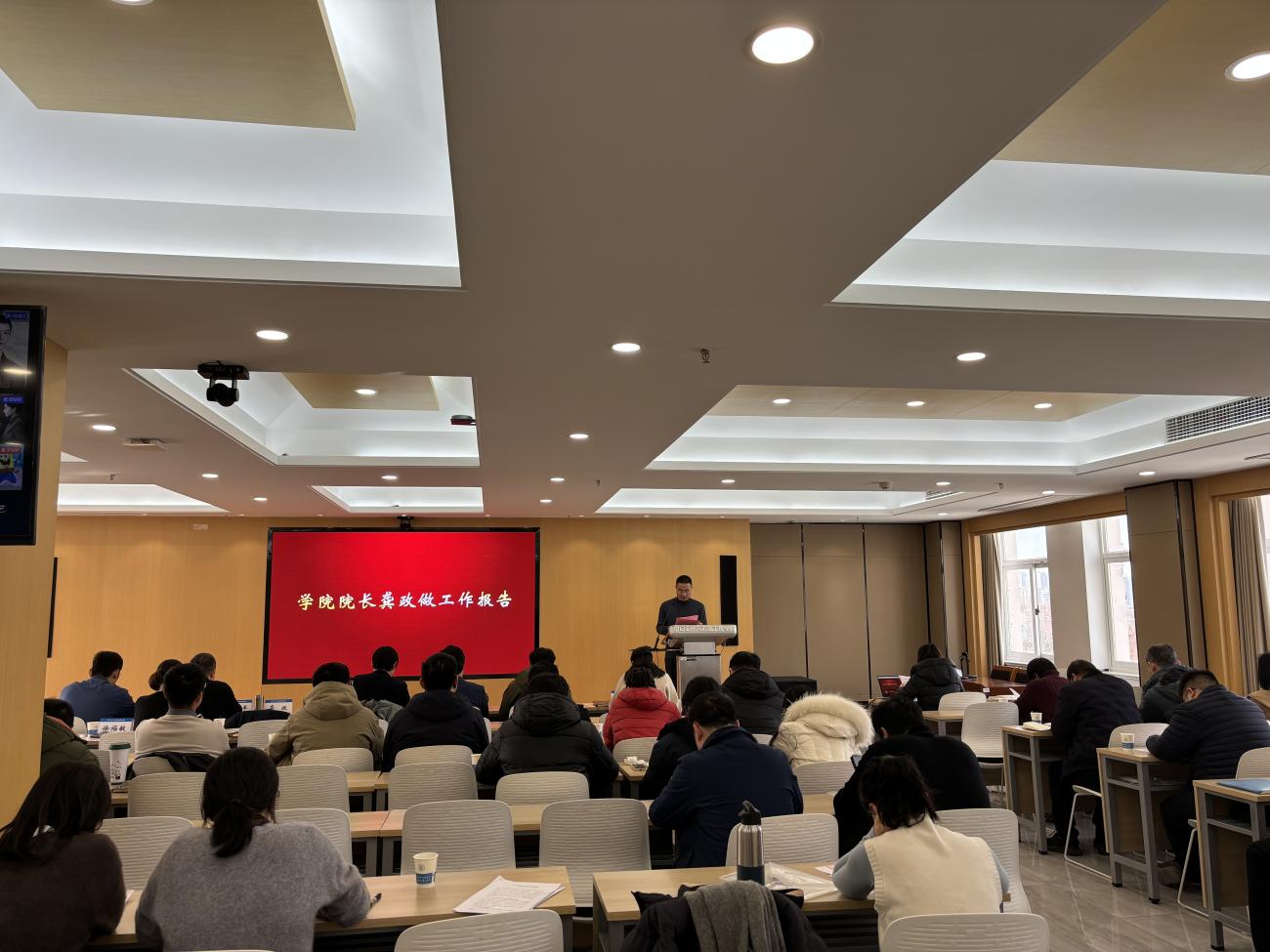 最后,学院党委书记张雪刚讲话,他指出:学院教代会、分工会工作与学院中心工作密不可分,要紧紧围绕这些新任务、新要求,期待新一届委员积极配合并参与到教代会和分工会服务中心大局的各项工作中,砥砺前行,为学院实现高质量发展贡献力量!