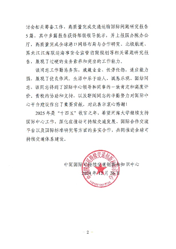 NT动漫 靳闯副研究员于2024年8月至2025年7月借调至交通部下属事业单位中国国际可持续交通创新和知识中心(以下简称“国际中心”),协助开展交通部国际合作、全球可持续交通高峰论坛、北极航道、全球港口网络布局、国际道路运输等相关工作。