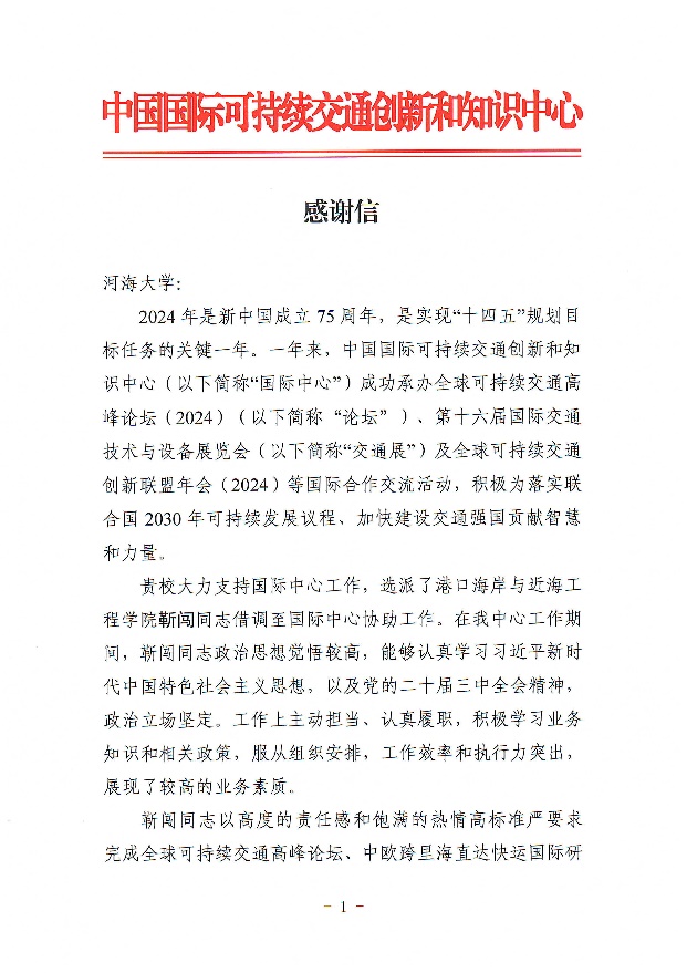 近日,国际中心向我校致信,对NT动漫 副研究员靳闯同志在借调期间的贡献给予了高度评价,同时向学校及学院的鼎力支持表达了诚挚的谢意。信中指出,在国际中心工作期间,靳闯副研究员展现出了高度的敬业精神和扎实勤恳的工作作风,在交通国际问题研究及国际合作等方面展现了过硬的业务素质和突出的工作能力,相关研究报告获得了部级领导批示,为推动交通领域的国际合作与发展提供了有力的智力支持。