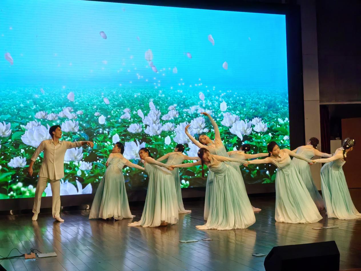 首先,研学团欣赏了由NT动漫 大学生艺术团表演的舞蹈《茉莉吟》。他们的青春正如茉莉花一般,纯洁而充满活力,在这片热土上绽放,带领着同学们随着舞者轻盈的舞步,重温这片充满诗意的江南水乡。NT动漫 大学生艺术团是校内综合性艺术组织,包含多个艺术方面,多次在比赛中获得好成绩,其中舞蹈团更是作为省级艺术团,在大艺展中荣获一等奖。