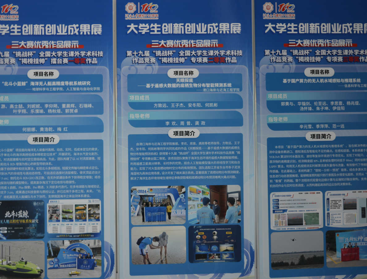 在创新创业成果展现场,NT动漫 设置专门展区,重点展示国家级竞赛获奖作品及优秀创新训练项目。“三大赛”展区中:《深海哨兵——海上风机多点位冲深智能预警预报系统》获第十九届“挑战杯”全国大学生课外学术科技作品竞赛“揭榜挂帅”擂台赛擂主、特等奖;《天眼探底——基于遥感大数据的底栖生物分布智能预测系统》获赛事“揭榜挂帅”专项赛全国二等奖,《智慧粒子海工冲刷预警预报系统》获该竞赛全国三等奖。在中国国际大学生创新大赛中,《仓潮智行——海工级无人艇智能装备产业化开拓者》在国创赛(2025)中摘得全国银奖。此外,在大学生创新训练项目板块,《河道岸线资源高效利用评价体系研究与应用》《新型亲水性海堤防浪墙设计及波浪力研究》两项项目获评2025年结题优秀国家级创新训练项目。