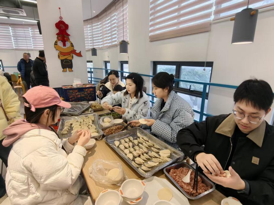 活动现场张灯结彩、喜气洋洋。红灯高挂、舞台庄重,整体布置简洁大方、年味十足,营造出热烈而温馨的节日氛围。在场师生还共同参与包饺子活动,在其乐融融的互动中感受浓厚的节日温情,现场氛围热烈而温馨。